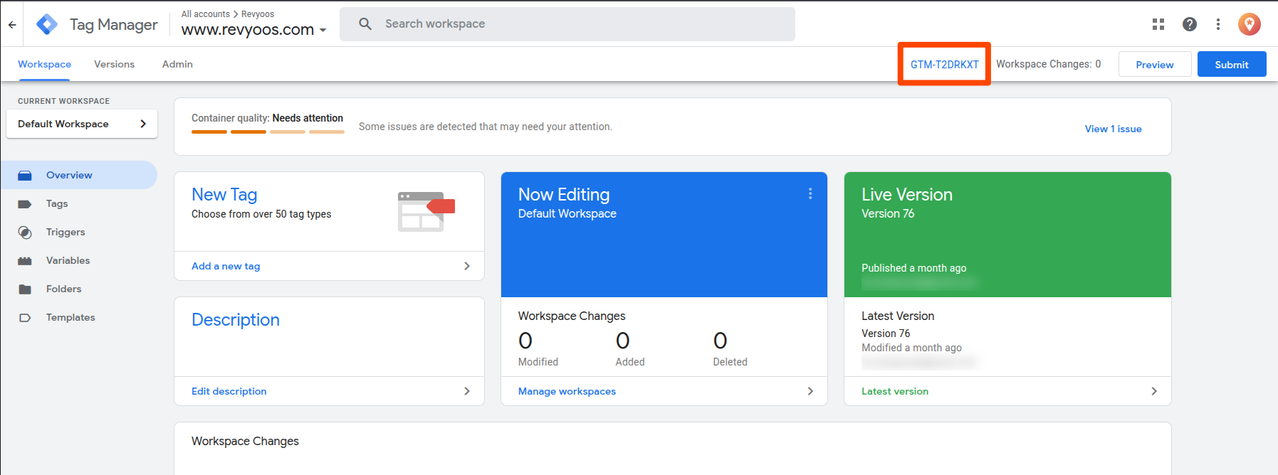 First, you need to ensure the universal Revyoos code is set up in your GTM account. This code allows you to add floating widgets to your page without requiring additional code snippets later.